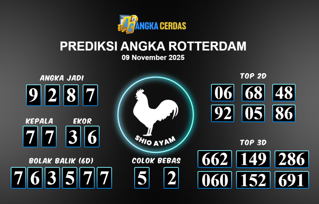 Prediksi Togel ROTTERDAM untuk hari ini Minggu 09 November 2025, adalah salah