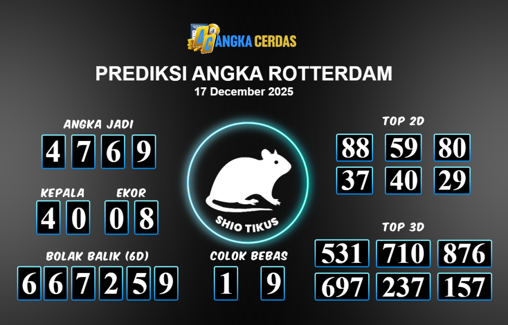 Prediksi Togel ROTTERDAM untuk hari ini Rabu 17 Desember November 2025, adalah salah