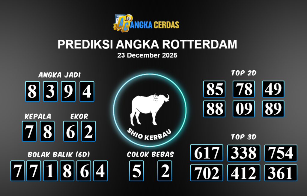 Prediksi Togel ROTTERDAM untuk hari ini Selasa 23 Desember November 2025, adalah salah