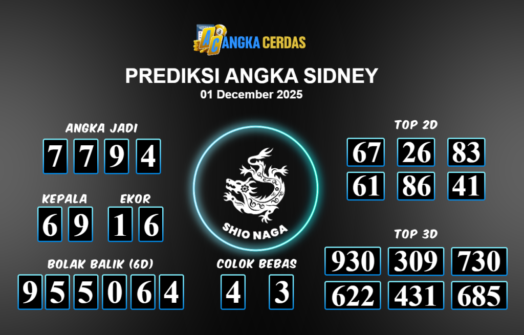 Prediksi Togel SIDNEY untuk hari ini Senin 1 Desember November 2025, adalah salah