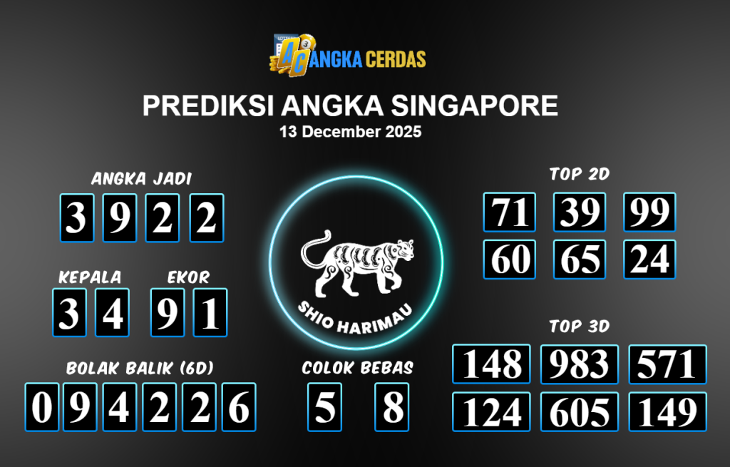 Prediksi Togel SINGAPORE untuk hari ini Sabtu 13 Desember November 2025, adalah salah