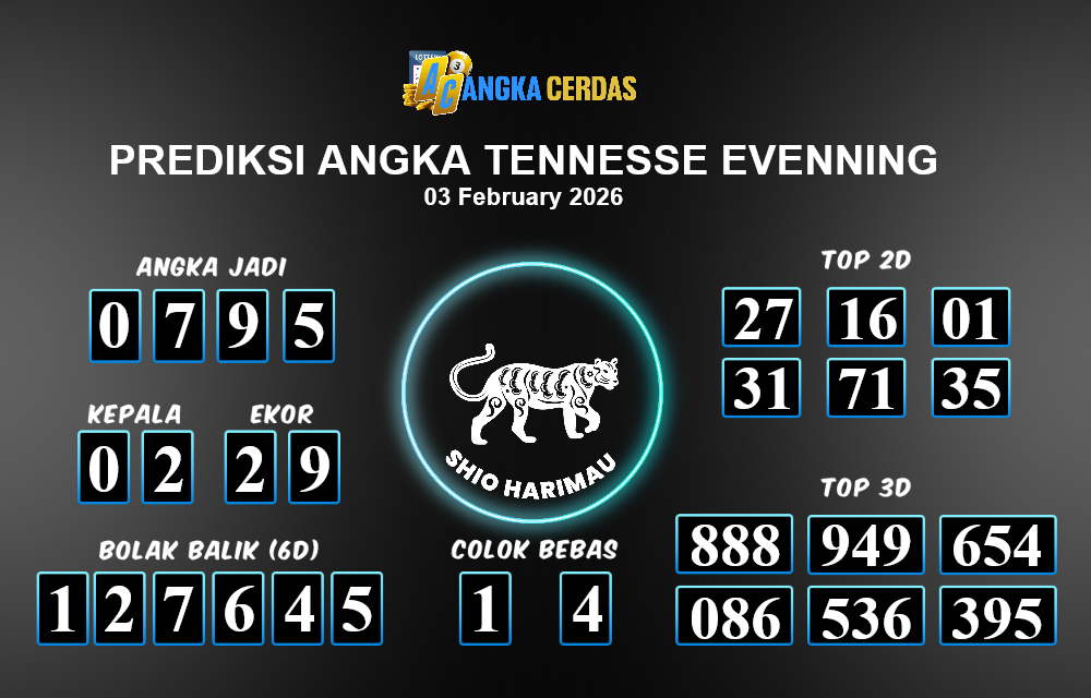 Prediksi Togel TENNESSE EVENNING untuk hari ini Selasa 03 Februari 2026, adalah salah
