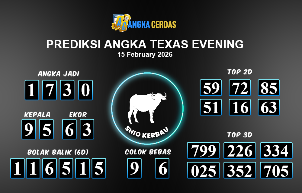 Prediksi Togel TEXAS EVENING untuk hari ini Minggu, 15 Februari 2026, adalah salah