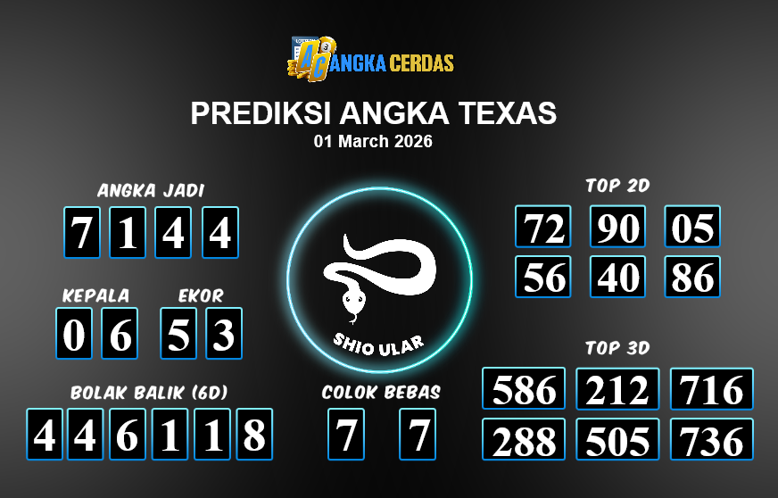 Prediksi Togel TEXAS untuk hari ini Minggu, 01 Maret 2026, adalah salah