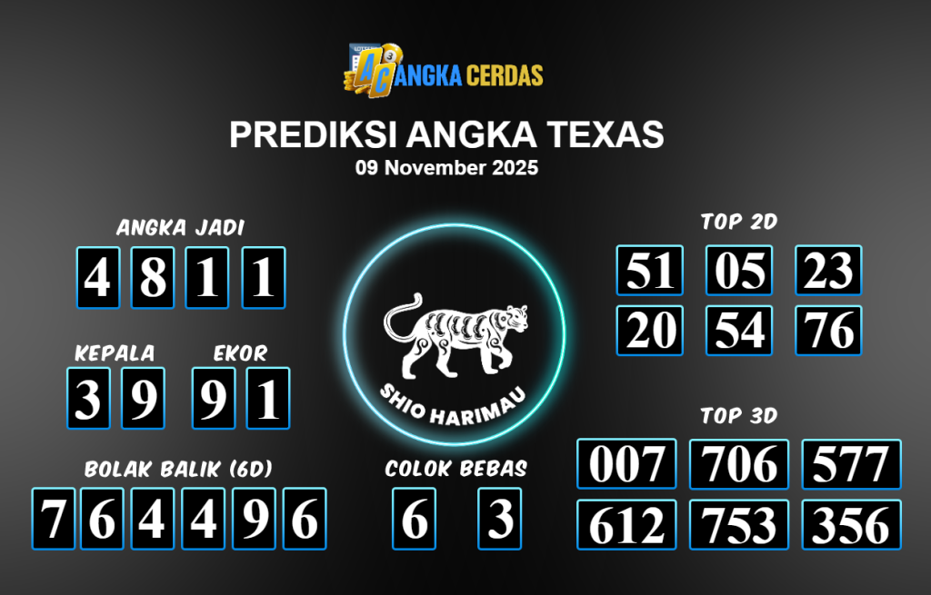 Prediksi Togel TEXAS untuk hari ini Minggu 09 November 2025, adalah salah