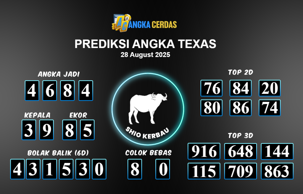 Prediksi Togel TEXAS untuk hari ini Kamis 28 Agustus 2025, adalah salah