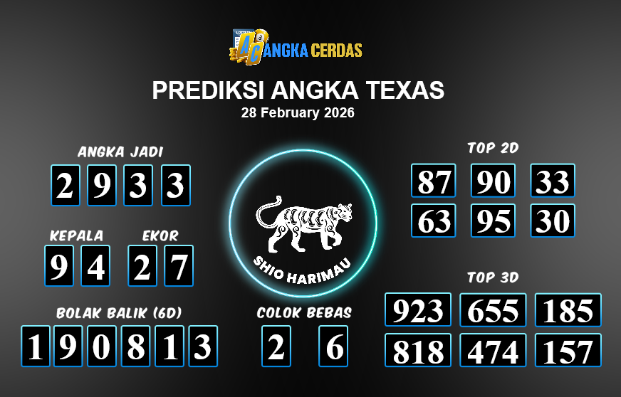 Prediksi Togel TEXAS untuk hari ini Sabtu, 28 Februari 2026, adalah salah