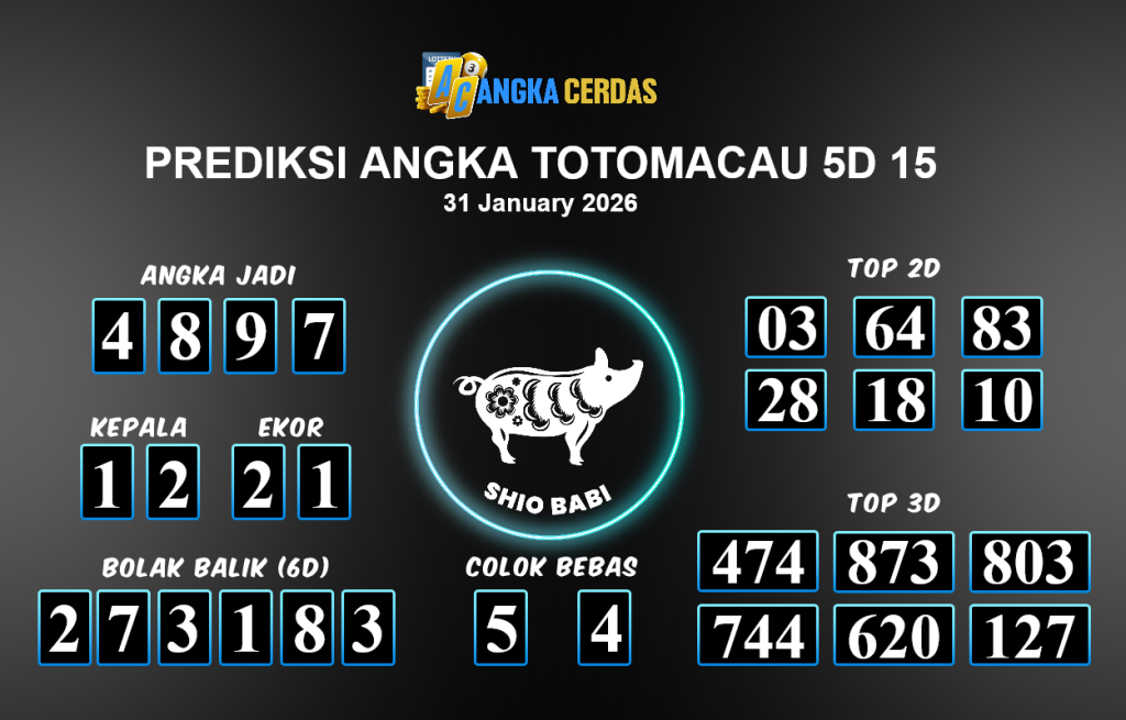 Prediksi Togel TOTOMACAU 5D 15 untuk hari ini Sabtu 31 Januari 2026,adalah salah