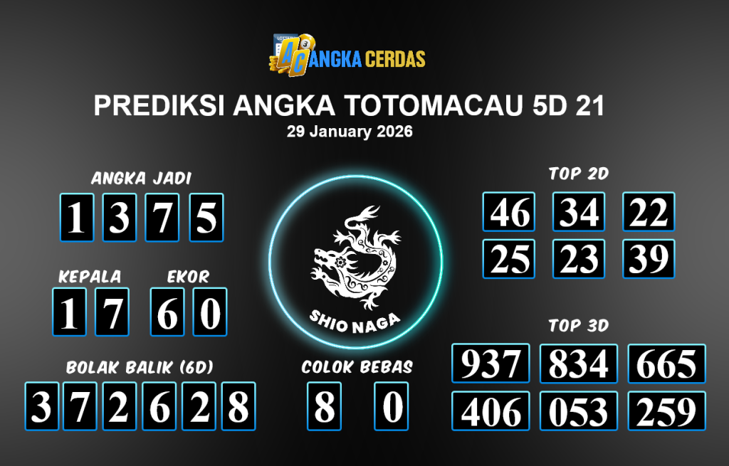 Prediksi Togel TOTOMACAU 5D 21 untuk hari ini Kamis 29 Januari 2026,adalah salah
