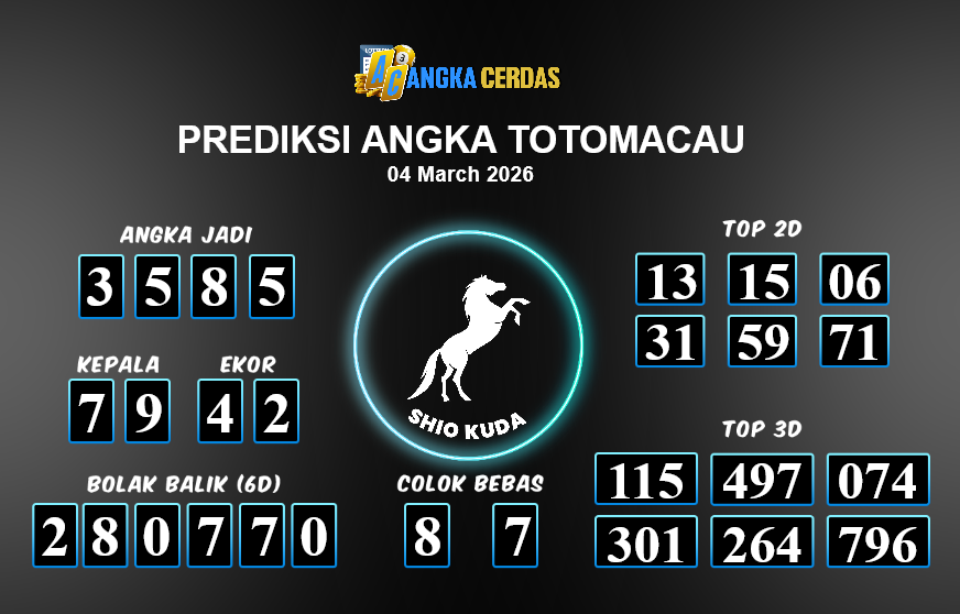 Prediksi Togel TOTOMACAU untuk hari ini Rabu, 04 Maret 2026, adalah salah