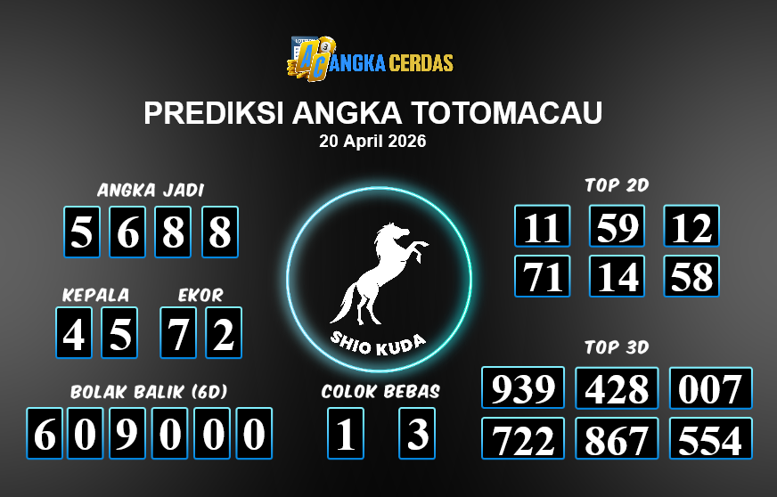 Prediksi Togel TOTOMACAU untuk hari ini Senin, 20 April 2026, adalah salahsatu jenis togel yang memiliki banyak penggemar.Ini terutama ditujukanbagi Anda yang menyukai 4d/3d/2d. Prediksi Angka Cerdas yang kamisediakan,bisa