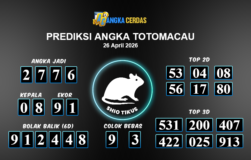 Prediksi Togel TOTOMACAU untuk hari ini Minggu, 26 April 2026, adalah salahsatu jenis togel yang memiliki banyak penggemar.Ini terutama ditujukanbagi Anda yang menyukai 4d/3d/2d. Prediksi Angka Cerdas yang kamisediakan,bisa