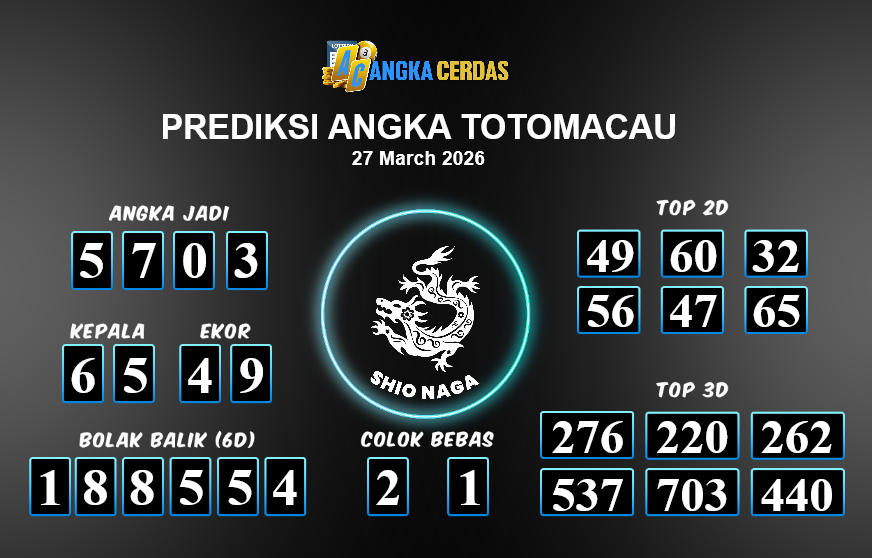 Prediksi Togel TOTOMACAU untuk hari ini Jumat, 27 Maret 2026, adalah salah
