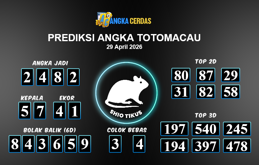 Prediksi Togel TOTOMACAU untuk hari ini Rabu, 29 April 2026, adalah salahsatu jenis togel yang memiliki banyak penggemar.Ini terutama ditujukanbagi Anda yang menyukai 4d/3d/2d. Prediksi Angka Cerdas yang kamisediakan,bisa