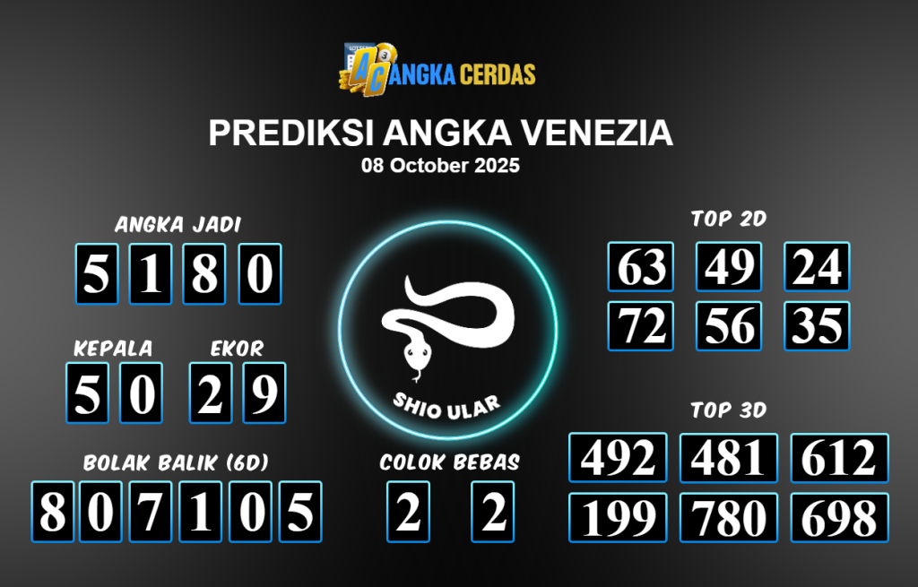 Prediksi Togel VENEZIA untuk hari ini Rabu 08 Oktober 2025, adalah salah