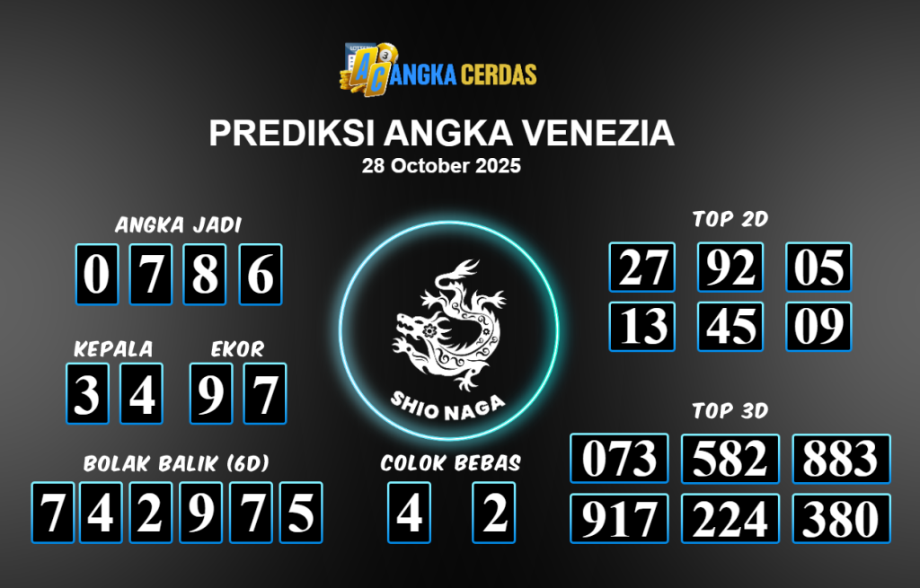 Prediksi Togel VENEZIA untuk hari ini Senin 28 Oktober 2025, adalah salah