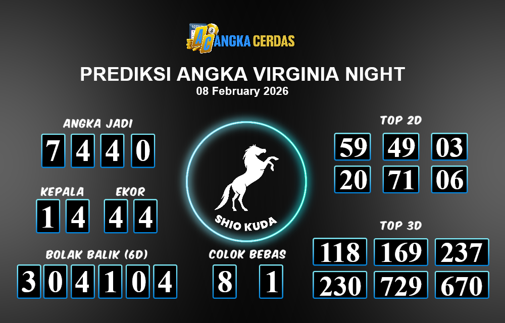 Prediksi Togel VIRGINIA NIGHT untuk hari ini Minggu, 08 Februari 2026, adalah salah