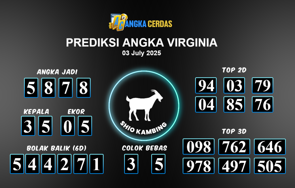 Prediksi Togel VIRGINIA untuk hari ini Kamis, 03 Juli 2025, adalah salah