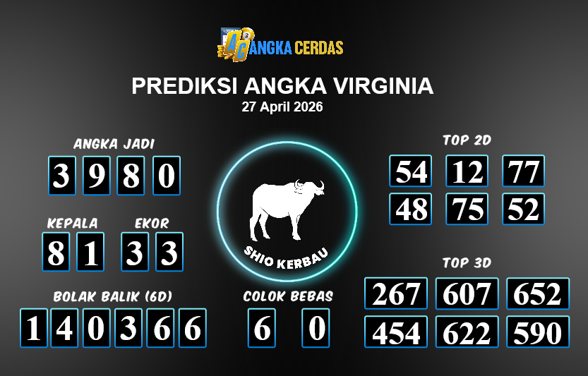 Prediksi Togel VIRGINIA untuk hari ini Senin, 27 April 2026, adalah salahsatu jenis togel yang memiliki banyak penggemar.Ini terutama ditujukanbagi Anda yang menyukai 4d/3d/2d. Prediksi Angka Cerdas yang kamisediakan,bisa