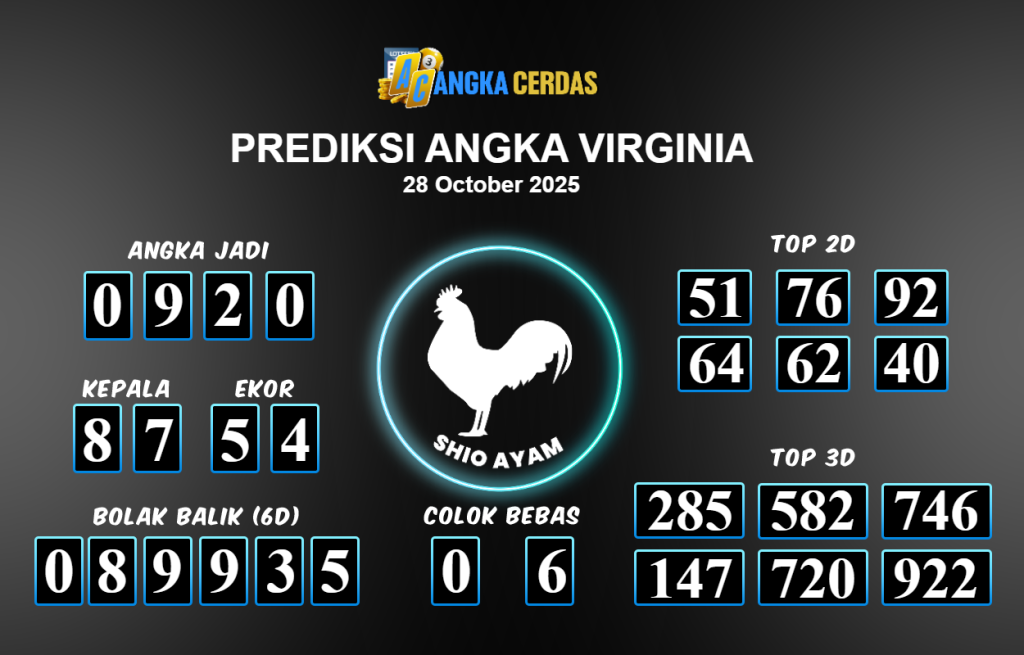 Prediksi Togel VIRGINIA untuk hari ini Senin 28 Oktober 2025, adalah salah